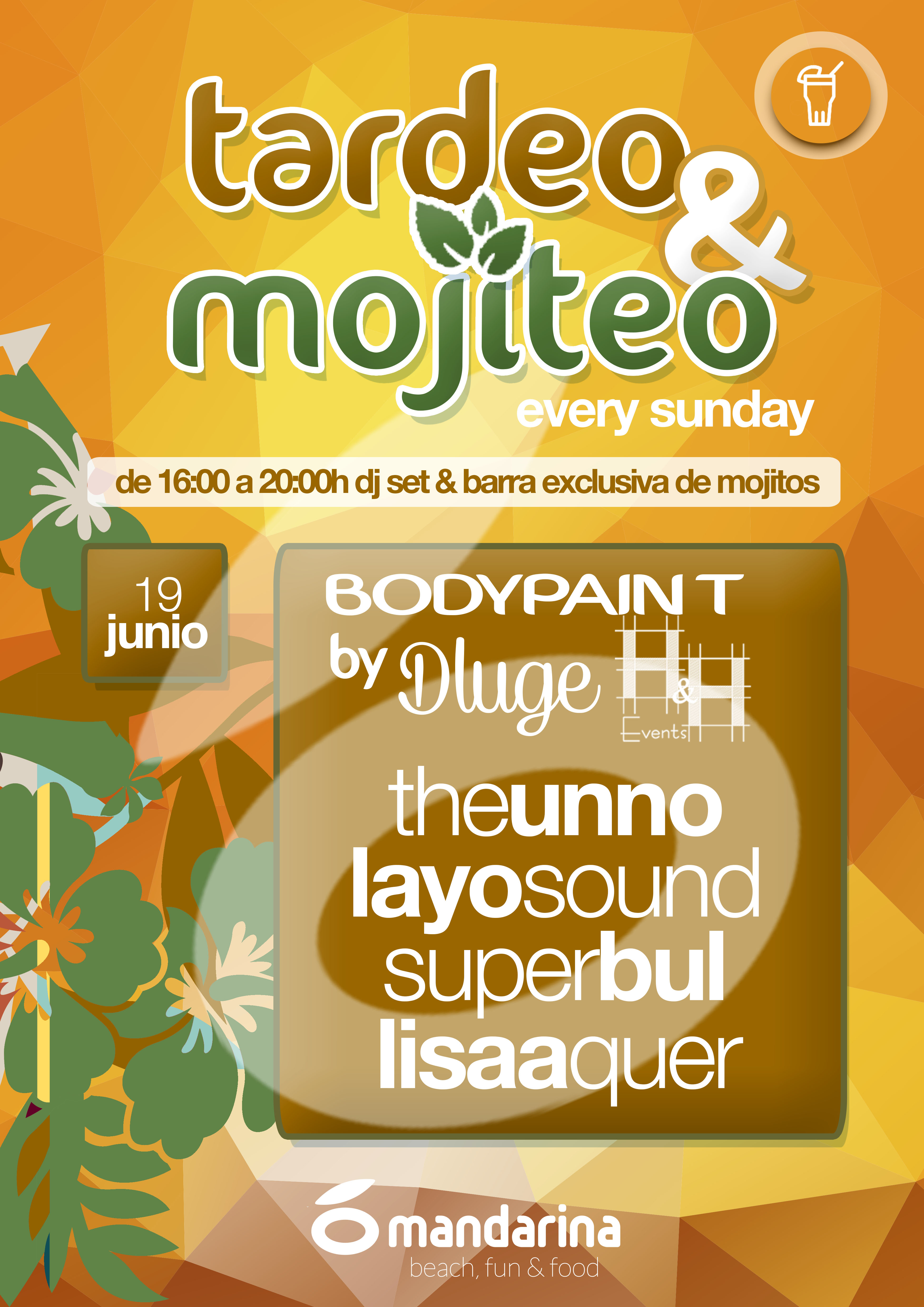 Tardeo dominical con barra exclusiva & masterclass de mojitos «hazte el tuyo propio», animación y música con Lisaa Quer, TheUNNO, LayoSound & Bul a los platos.